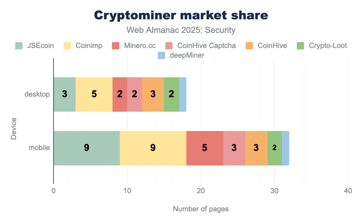 Although we find a very low absolute number of cryptominers on the web, we still take a look at the shares that different cryptominers represent. Compared to last year, we see the number of pages with Coinimp has dropped to match the nine pages that have JSEcoin. An interesting note to make is the difference between the number of cryptominers on desktop and mobile pages, with the number of pages on mobile being almost double the number on desktop.