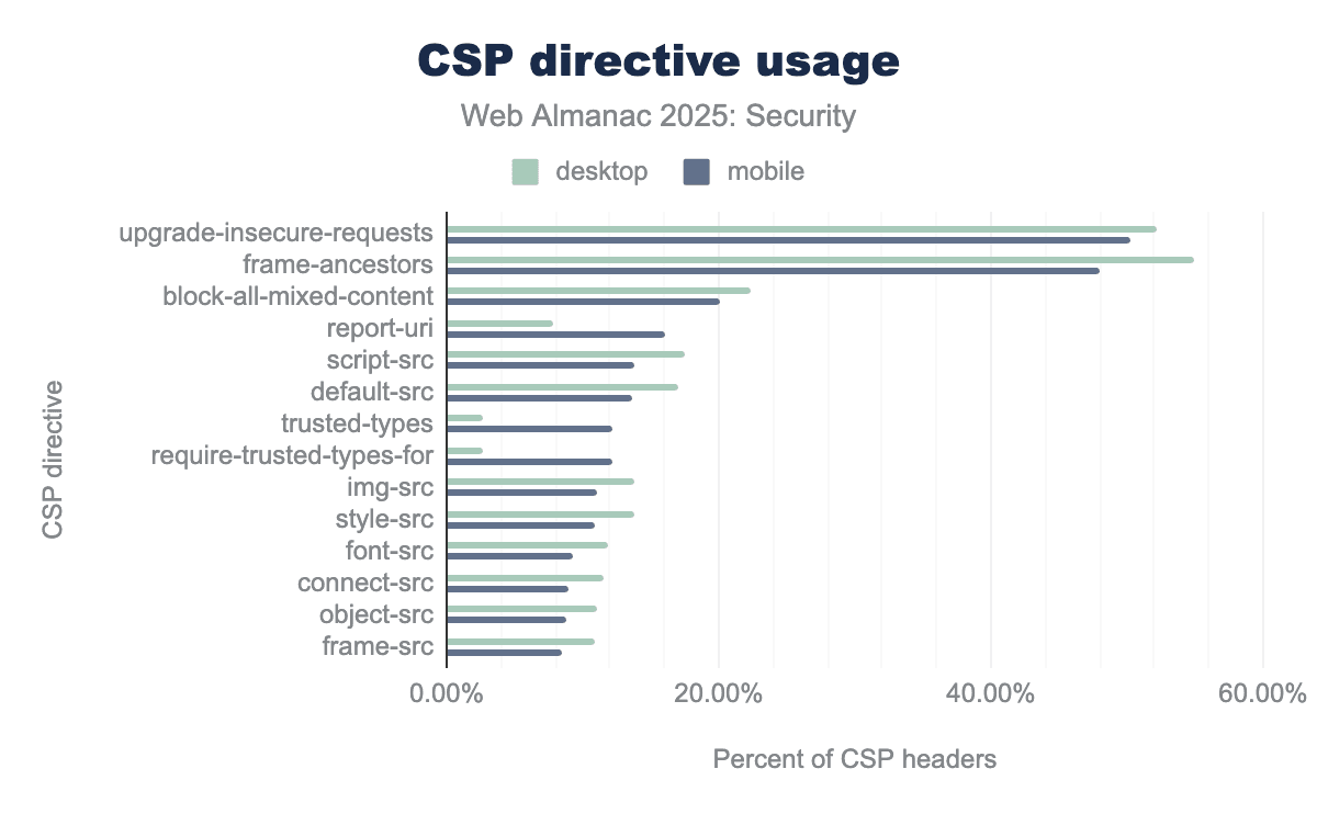 Once again, most websites use CSP for the upgrade-insecure-requests and frame-ancestors directives. The relative share of mobile sites using these directives has decreased slightly, which can be attributed to the higher number of CSP headers scanned. The absolute number has risen by 400,000 and 800,000 CSP headers on desktop and mobile respectively.