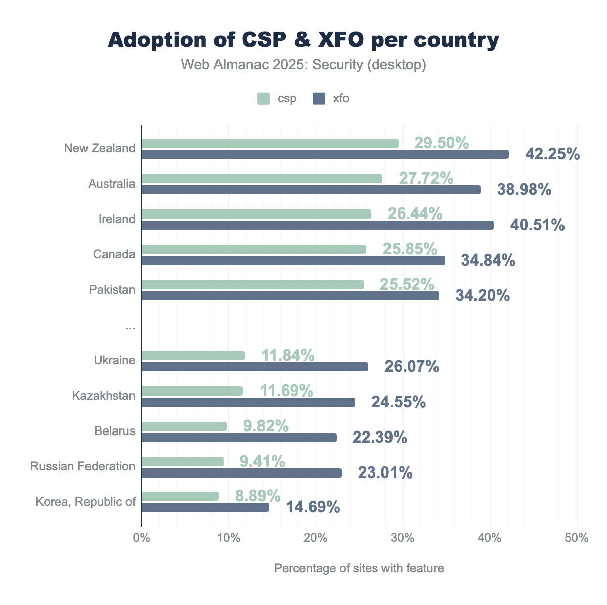 This security chapter shows positive trends in the adoption of web security policies. HTTPS is reaching near-100% adoption overall, and per-country metrics show every country is moving towards the goal of a universal use of HTTPS. We saw growing adoption of many modern security policies aiming to better protect users against modern attacks such as the Content-Security-Policy which saw an increase in use by over 18% and the Permissions-Policy which was used 50% more than last year. We also see newer policies like the Document Policy appear in the wild, showing that developers are actively working on adoption of new security features.