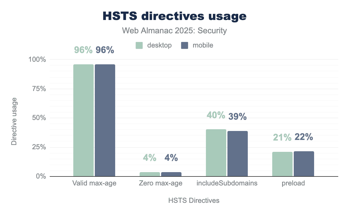 We see a continuing increase in the number of pages using an HSTS header, with a rise of 6 percentage points compared to last edition, up to 36% of all pages visited on mobile.