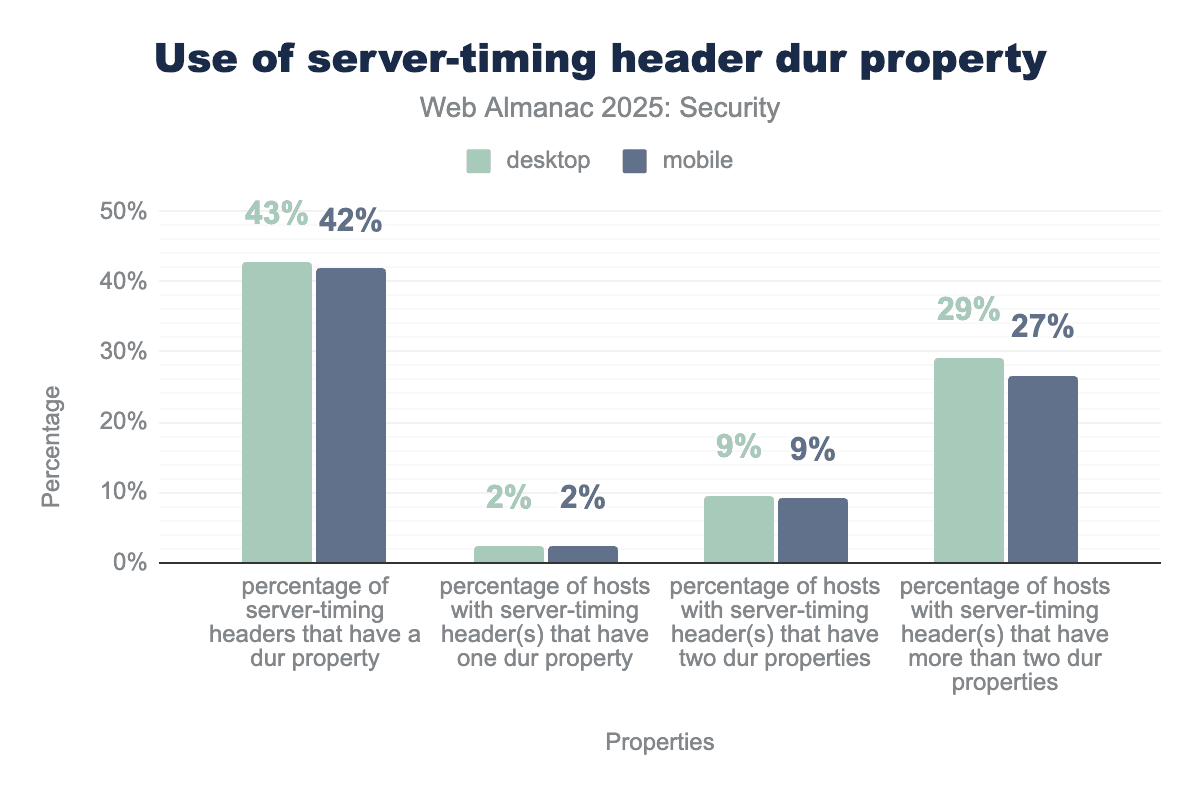 Of the server-timing headers on the web, we find 42% of them have at least one dur property. This is a relative decrease compared to last year, but given the steep incline in header use over the year, the absolute number has risen. This also means that more headers do not include a dur property and use the header for other purposes, possibly through the use of the desc property that allows developers to set a description for certain metrics.