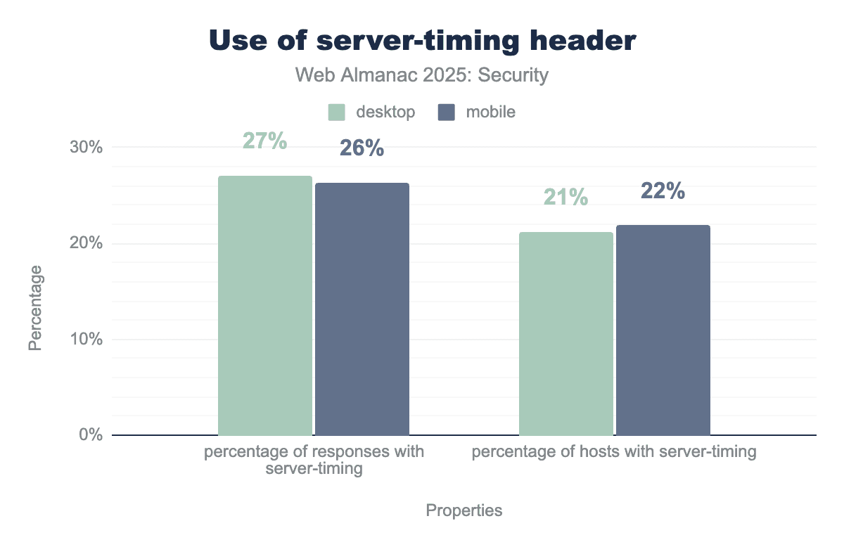 The percentage of hosts returning a server-timing header has increased by over 15% in use by over a fifth of hosts that have been visited by the crawler. This is a very steep increase since last year.