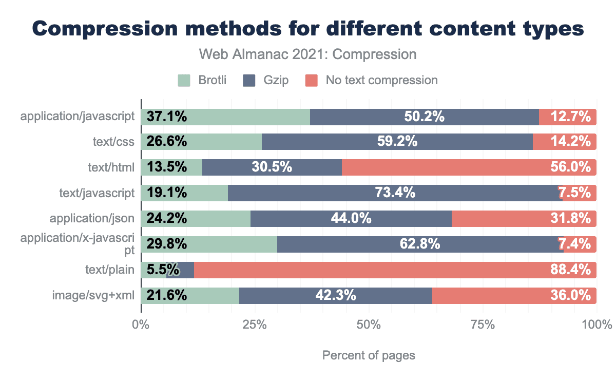 実質的にすべてのテキスト圧縮は、2つのHTTPコンテンツエンコーディングのうちの1つによって行われます。GzipBrotliです。BrotliとGzipの両方は、事実上すべてのブラウザでサポートされています。サーバー側では、nginxやApacheなどもっとも普及しているサーバーでBrotliやGzipを使用するように設定できます。この設定は、コンテンツが生成されるタイミングによって異なります。