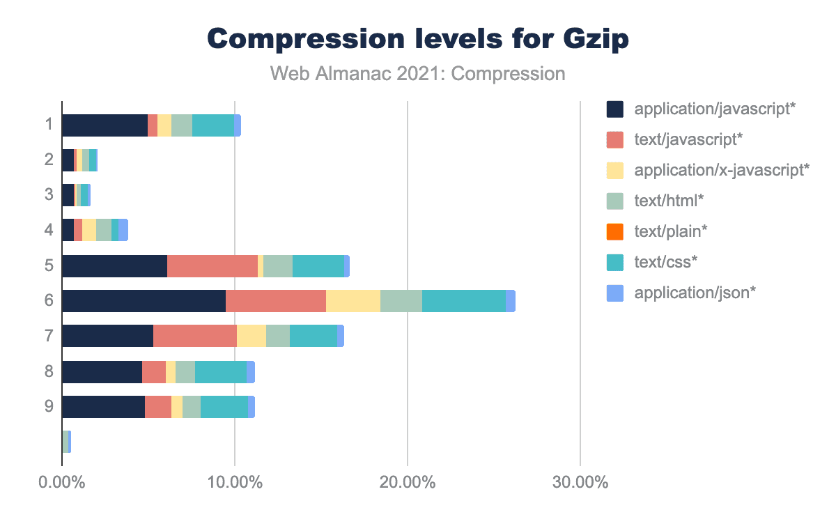 図は、各圧縮レベルをコンテンツタイプ別に分けたものです。ほぼすべてのケースで、JavaScriptがもっとも一般的なコンテンツタイプです。Brotliでは、もっとも高い圧縮レベルではJavaScriptの割合が低い圧縮レベルよりも高く、低い圧縮レベルではJSONが多くなっている。Gzipでは、JavaScriptのコンテンツタイプの分布はどのレベルでもほぼ同じです。