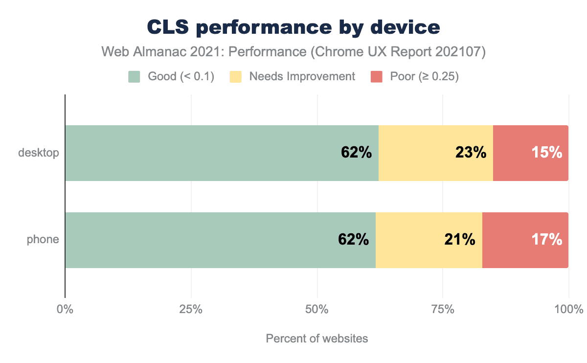 累積レイアウトシフト (CLS) は、FCPやLCPなどの視覚的な表示にかかる時間ではなく、ユーザーがどの程度のレイアウト シフトを経験するかによって特徴付けられます。このように、デバイスごとの性能はほぼ同等でした。