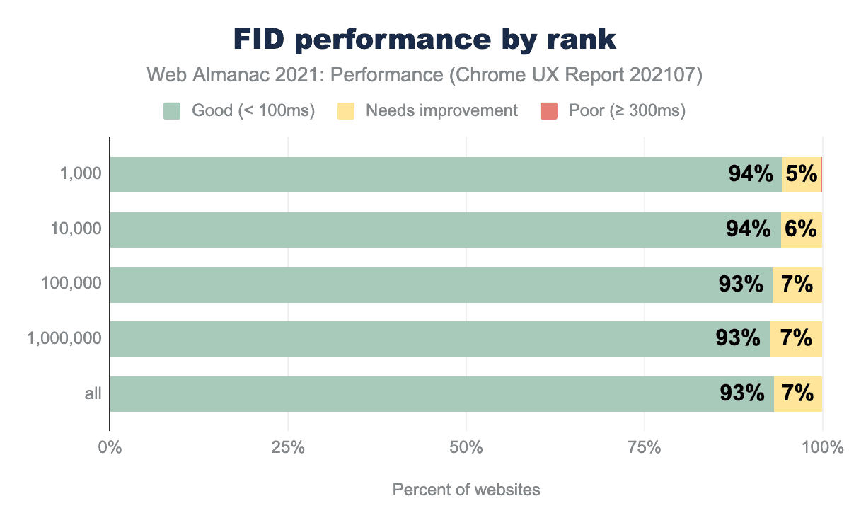 Core Web Vitalsでは、上位1,000サイトが他を大きく引き離している。グラフの真ん中には、CLSに起因するパフォーマンスの低下という興味深い谷が発生しています。FIDはすべてのグループ化で横ばいでした。他のすべての指標は、上位のランキングほど高いパフォーマンスを示すという相関関係にあります。
