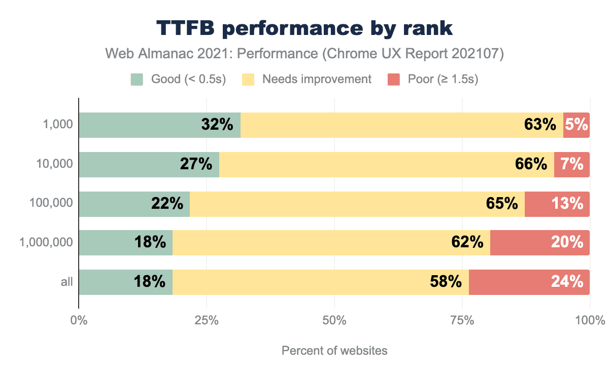 2021年7月に良好なTTFBを経験したWordPressのオリジンはわずか5%でした。上位1000万サイトにおけるWordPressの大きなシェアを考慮すると、そのTTFBの悪さがランクによるTTFBの劣化の一因である可能性があります。