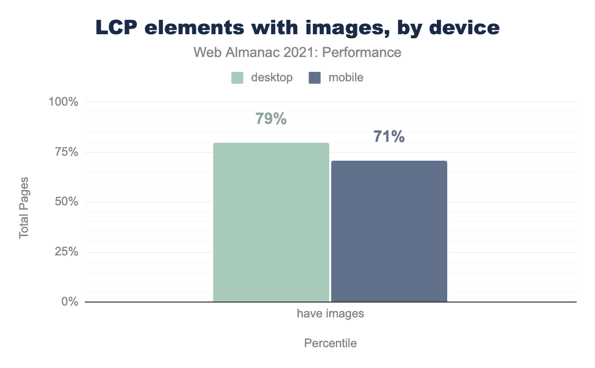 HTMLノードに関係なく、71-79%のページでLCP要素が、画像であったことがわかります。さらに、デスクトップ端末ではLCPが、画像である割合が高くなっています。これは、画面サイズが小さいため、画像がビューポートからはみ出し、見出しテキストがもっとも大きな要素になることが、原因である可能性があります。