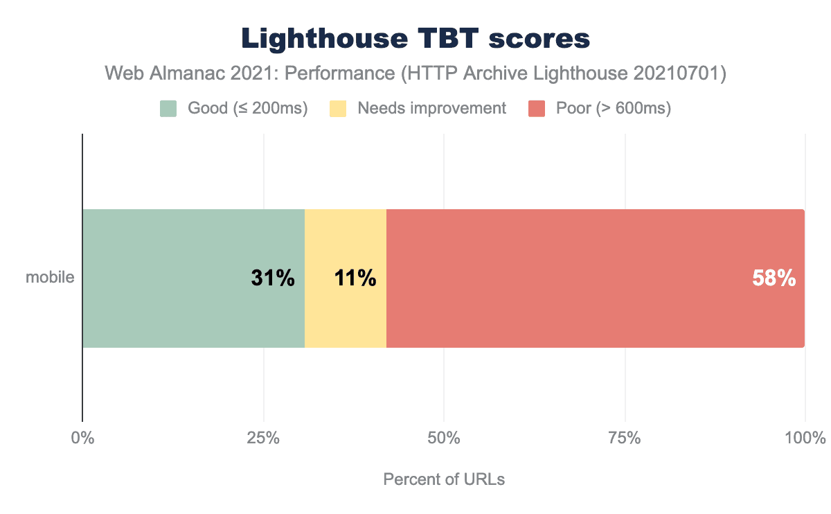 残念ながら、TBTはChromeユーザー体験レポートでは計測されていません。しかし、HTTP Archive Lighthouseのデータ(モバイルのみ収集)を使用すれば、状況を把握することは可能です。