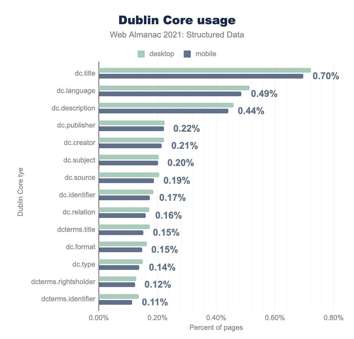 dc.title は0.70%、 dc.language では0.49%、 dc.description では0.44%、 dc.publisher では0.22%、 dc.creator では0.21%、 dc.subject では0.20%、 dc.source では19%、 dc.identifier が0.17%、 dc.relation が0.16%、 dcterms.title が0.15%、 dc.type が0.14%、 dcterms.rightsholder が0.12%、そして dcterms.identifier が0.11% となりました。デスクトップでの使用率もほぼ同じです。もっとも人気のある属性タイプはdc:title(0.70%のページ)であることは、驚くにはあたらない。しかし、dc:languageが0.49%の普及率で(description、subject、publisherなどの一般的な記述子より)次にあるのは興味深いことです。これは、Dublin Coreが多言語のメタデータ管理システムでよく使われていることを考えると、納得がいく。