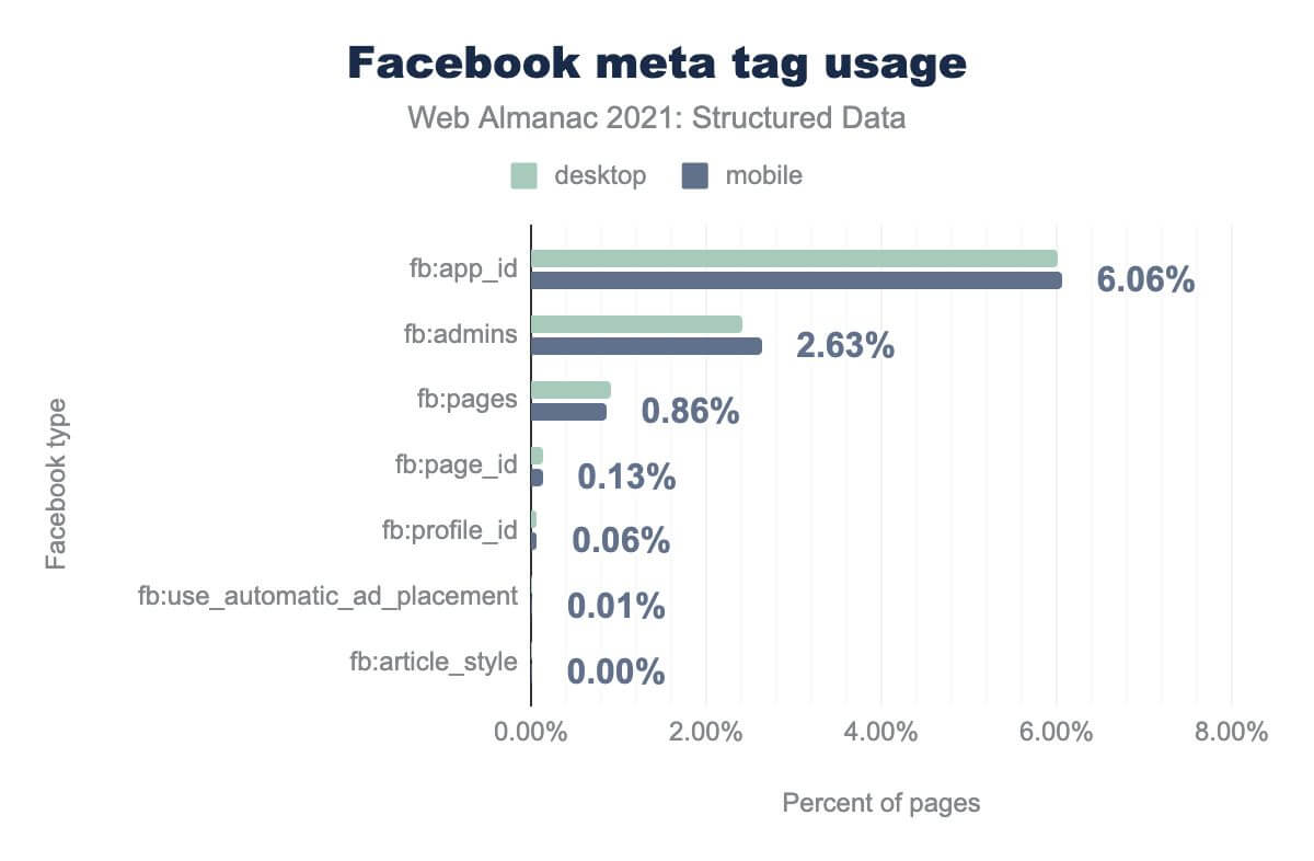 さらに少ないのは、og:imageタグに関するより具体的なメタデータで、og:image:width(12.95%のページ)、og:image:height(12.91%のページ)、 og:image:secure_url(5.61% のページ)と og:image:alt(1.75% のページ)の形式です。 HTTPSの採用がますます一般的になっている現在、og:image:secure_url(og:imageのhttpsバージョンを識別するためのもの)はほとんど冗長になっていることは注目に値します。