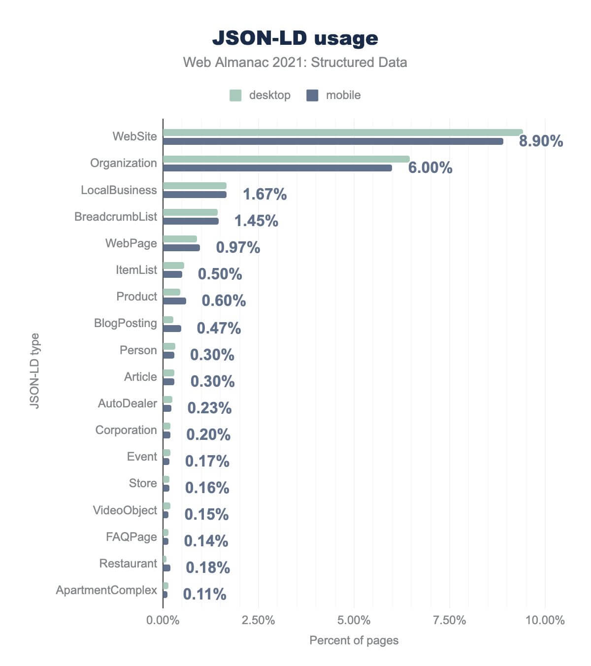 Website は8.90%、Organization で6.00%、LocalBusiness で1.67%、BreadcrumbList で1.45%、WebPage で0.97%、ItemList で0.50%、Product で0.60%、BlogPosting で0.46%、Person で0.40%。 30%, Article で0.30%, AutoDealer で0.23%, Corporation で0.20%, Event で0.17%, Store で0.16%, VideoObject で0.15%, FAQPage で0.14%, Restaurant で0.18% そして ApartmentComplex で0.11% であった。デスクトップでの使用率もほぼ同じです。予想されるように、今回の結果はmicrodataの利用を評価した結果と似ています。どちらのアプローチもschema.orgの使用に大きく偏っているため、この結果は拡大解釈されるでしょう。しかし、いくつかの興味深い違いがあります。