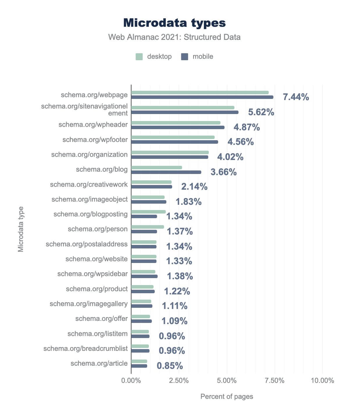 schema.org/ を削除して正規化)のうち、 webpage は7.44%、 sitenavigationelement で5.62%、 wpheader で4.87%、 wpfooter で4.56%、 organization で4.02%、 blog で3.66%、 creativework で2.14%、 imageobject で1.83%、 blogposting で1.34%、 person では1.37%、 postaladdress で1.34%、 website で1.33%、 wpsidebar で1.38%、 product で1.22%、 imagegallery が1.11%、 offer が1.09%、 listitem が0.96%、 breadcrumblist が0.96%、そして article が0.85% です。デスクトップでの使用率もほぼ同じです。分析したページでもっとも一般的なmicrodataのタイプは、Webページそのものを記述するもので、webpage(7.44%のページ)、sitenavigationelement(5.62%のページ)、wpheader(4.87% of pages)とwpfooter(4.56% of pages)などのプロパティが利用されました。
