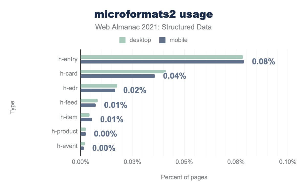 h-entryは0.08% h-card では0.04% h-adr では0.02% h-feed では0.01% h-item では0.01% h-product では0.01% 未満、 h-event では0.01% 未満となっています。デスクトップでの使用率もほぼ同じです。レガシーなマイクロフォーマットとよりモダンなバージョンの違いは大きく、マークアップの使用における行動や嗜好の変化に関する興味深い洞察が得られます。