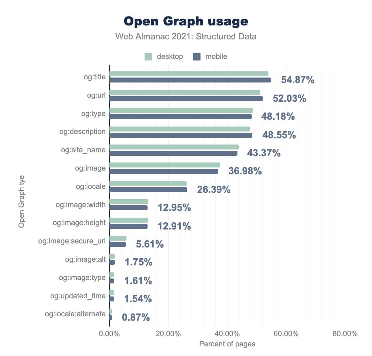title が54.87%、 og:url が52.03%、 og:type が48.18%、 og:description が48.55%、 og:site_name が43.37%、 og:image が36.98%、 og:locale が26.39%、 og:image:width が12.40%、og:security が12.40%、go:text が12.40%、 gogo が3.40%、ogo:text が3.40%です。 95%、 og:image:height が12.91%、 og:image:secure_url がWeb上でのOpen Graphタグの利用状況を示す棒グラフ。データに含まれるすべてのモバイルページのうち og:title が54.87%、 og:url が52.03%、 og:type が48.18%、 og:description が48.55%、 og:site_name が43.37%、 og:image が36.98%、 og:locale が26.39%、 og:image:width が12.95%、 og:image:height が12.91%、 og:image:secure_url が5.61%、 og:image:alt が1.75%、 og:image:type が1.61%、 og:updated_time が1.54%、そして og:locale:alternate が0.87% であります。デスクトップでの使用率もほぼ同じです。5.61%、 og:image:alt が1.75%、 og:image:type が1.61%、 og:updated_time が1.54%、そして og:locale:alternate が0.87% であります。デスクトップでの使用率もほぼ同じです。もっとも一般的なOpen Graphタグはog:titleであり、54.87%のページで見受けられる。これは、どのような種類のものが表現されているか(例: og:type ページの48.18%に掲載)、どのように表現されるべきか(例: og:descriptionページの48.55%に掲載)を記述する関連属性のセットに密接に追随しています。