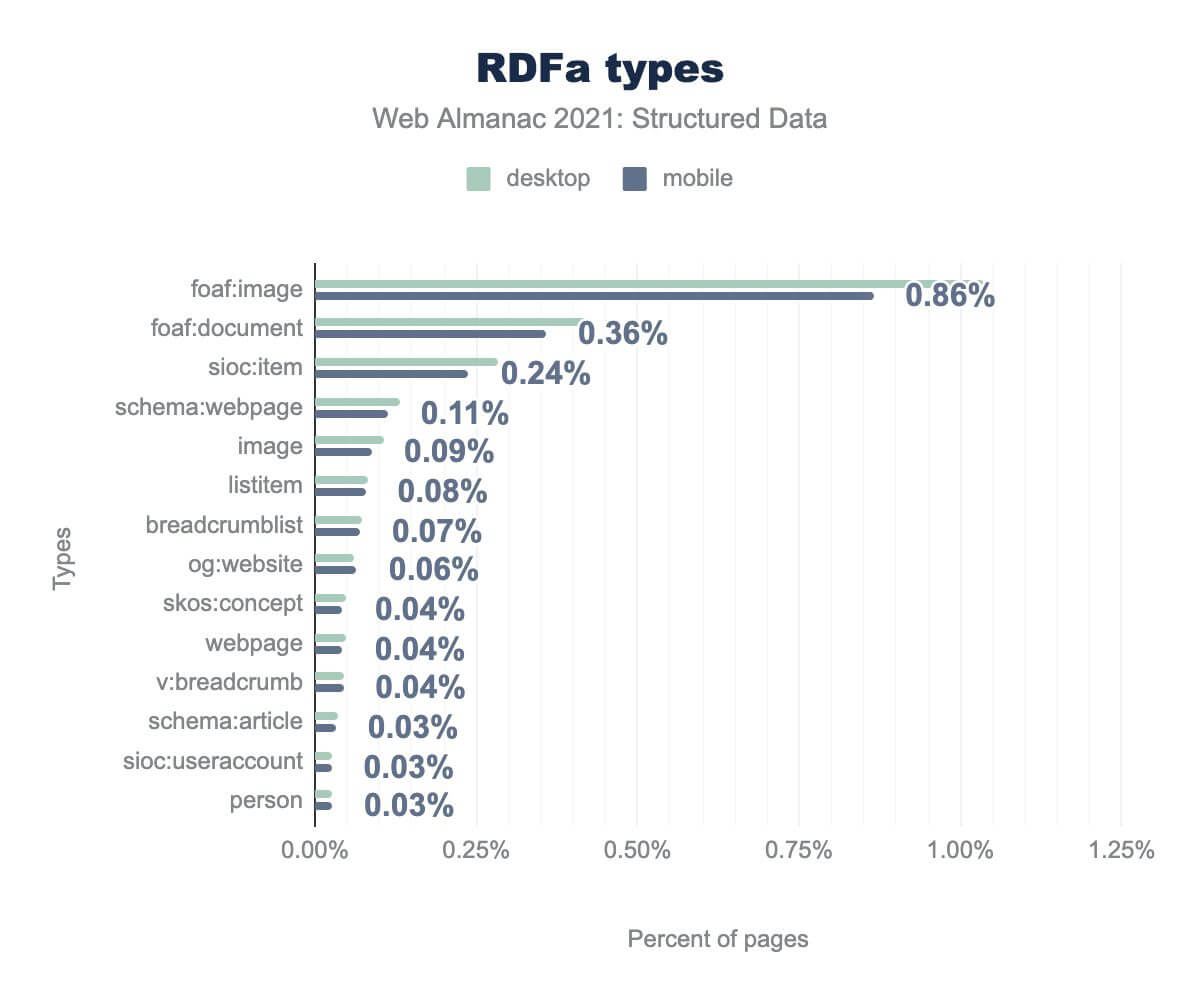 foaf:image は0.86%、 foaf:document では0.36%、 sioc:item では0.24%、 schema:webpage では0.11%、 image では0.9%、 listitem では0.08%、 breadcrumblist では007%、 og:website では0.06%、 skos:concept では0.04%、 webpage では0.04%、 v:breadcrumb では0.04%、 schema:article では0.03%、 sioc:useraccount では0.03%、そして person では0.03% であった。デスクトップでの使用率もほぼ同じです。RDFaのタイプを評価すると、foaf:image構文が他のタイプよりもはるかに多くのページに存在し、データセットの全ページの0.86%以上であることがわかります。これは小さな割合に見えるかもしれませんが、65,000ページを表し、発見されたRDFaマークアップ全体の60%以上に相当します。
