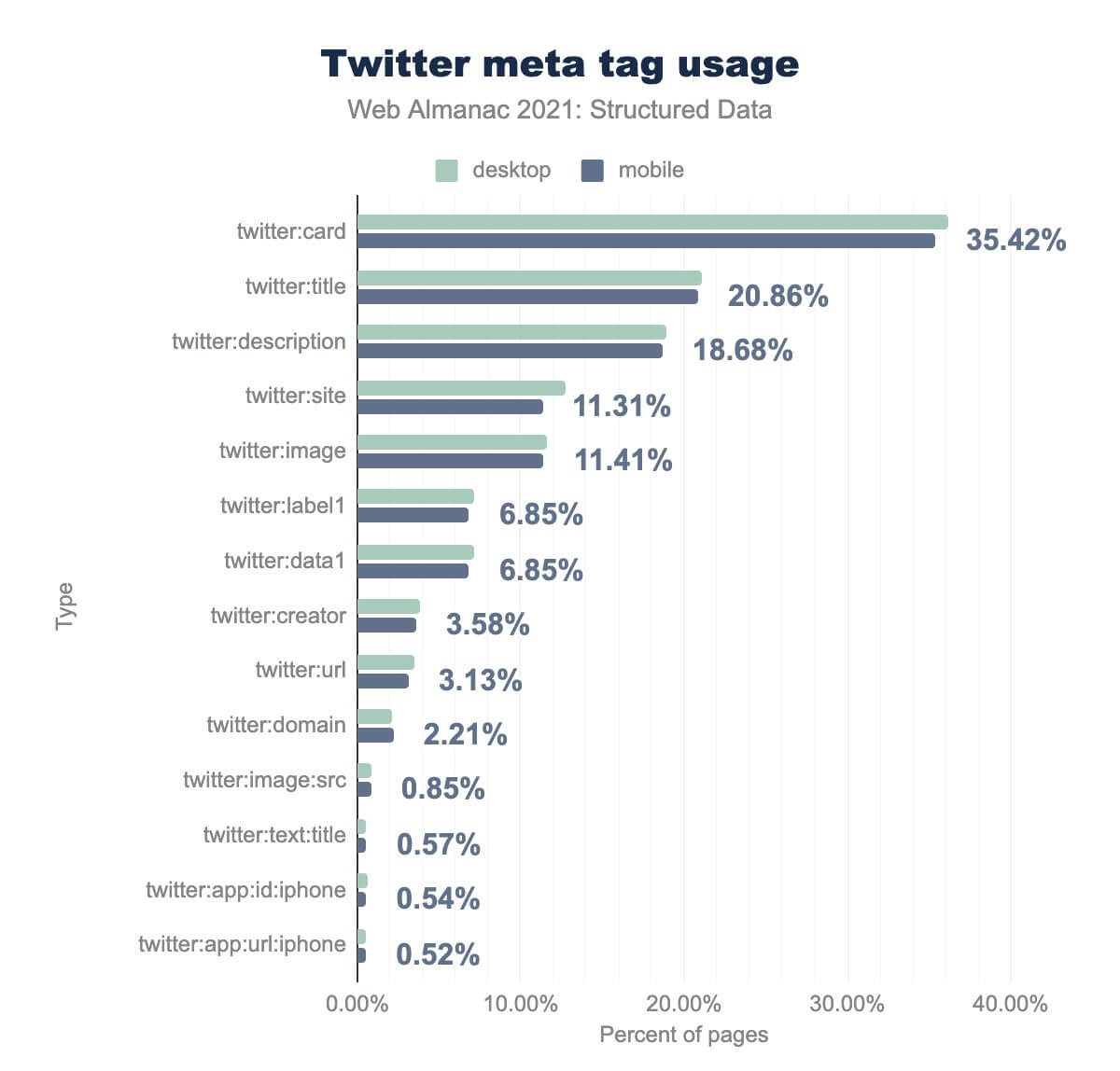 twitter:card が35.42%、twitter:title が20.86%、twitter:description が18.68%、twitter:site が11.31%、twitter:image が11.41%、twitter:label1 が6.85%, twitter:data1 が6.85%、twitter:creator が3.58%、twitter:url が3.13%、twitter:domainが2.21%、twitter:image:src が0.58%, twitter:text:title が0.57%、 twitter:app:id:phone が0.54%、twitter:app:url:iphone が0.52% であった。デスクトップでの使用率もほぼ同じです。もっとも一般的なTwitterのメタタグはtwitter:cardで、全ページの35.42%に見られました。このタグは、プラットフォームで共有される際のページの表示方法を定義するために使用できます(例:summary、メディアオブジェクトに関する追加データと組み合わせた場合のplayerなど)。