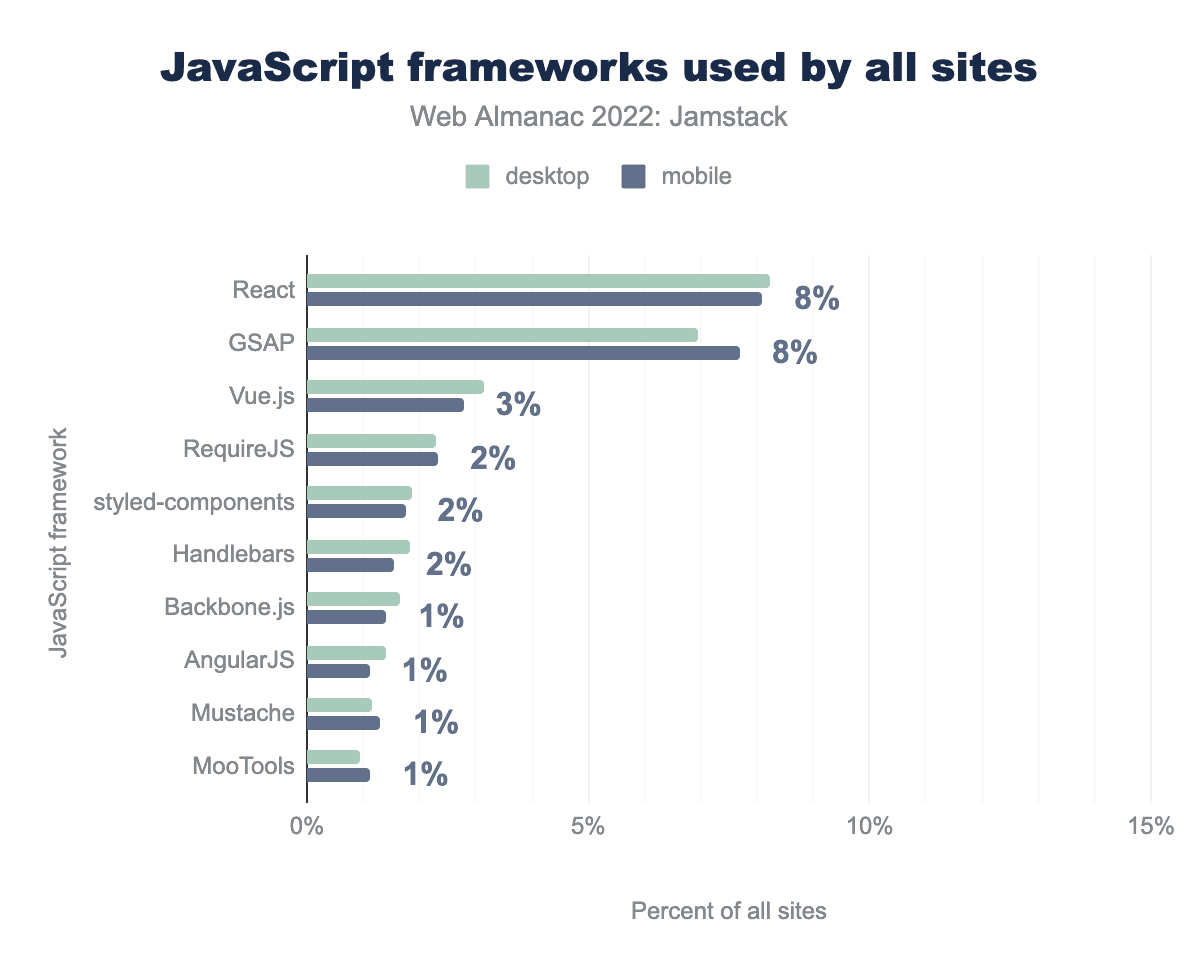 Wappalyzerには、「ウェブフレームワーク」と「JavaScriptフレームワーク」というやや任意的な区別があります。こちらが全体のウェブでトップ10のJavaScriptフレームワークです。