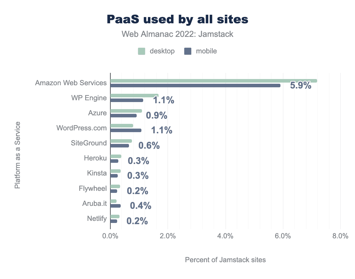 すべてのプラットフォームリストから欠けているのは、Webの巨人であるCloudflareですが、WappalyzerはCloudflareをPaaSではなくCDNとして分類しています。ただし、Cloudflareには非常にJamstack的なPaaSオファリングであるCloudflare Pagesがありますが、Wappalyzerのデータは「CDN上でホストされている」と「そのCDN上に一部のアセットをホストしている」とを区別していないため、この分析には含めることができませんでした。著者は、Cloudflareが非常に人気のあるJamstackホスティングオプションであると考えていますが、これを確認するための良いデータはありません。