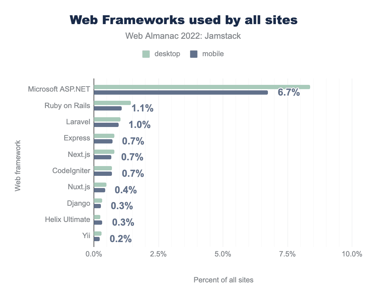 質問はおもしろいです。Next.jsとNuxt.jsがウェブフレームワークとみなされ、Vue.jsとReactはJavaScriptフレームワークとみなされる理由は何でしょうか?さておき、MicrosoftのASP.NetフレームワークがWeb全体で非常に人気がありますし、Ruby on Railsも同様です。Jamstackではどうでしょうか?