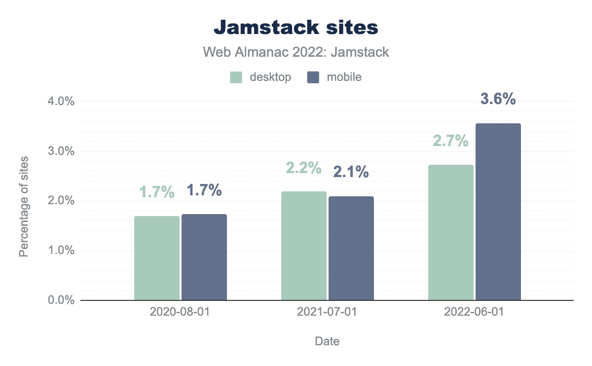 Webの3.6%(またはデスクトップの2.7%)が正確にJamstackであるかどうかは、Jamstackの定義が検証できないアーキテクチャの選択に依存しているため、私たちは確実に言うことはできませんが、Jamstackが成長していることは確かです。私たちの基準を満たすサイトの割合は年々着実に増加しています。Webはより「Jamstack的」になっています。