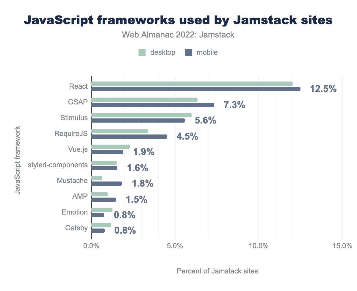 一見すると、ASP.NetがまだJamstack-yグループで第1位であり、PHPベースのSymfonyが第2位になるのはさらに驚くかもしれません。しかし、ASP.NETやPHPを使用しても、パフォーマンスの高い、現代的なサイトを構築する理由はありません。Jamstackは特定の技術リストではなく、建築的アプローチですので、流行に乗っていない技術スタックで働く人々にとっては励みになる結果だと思います。