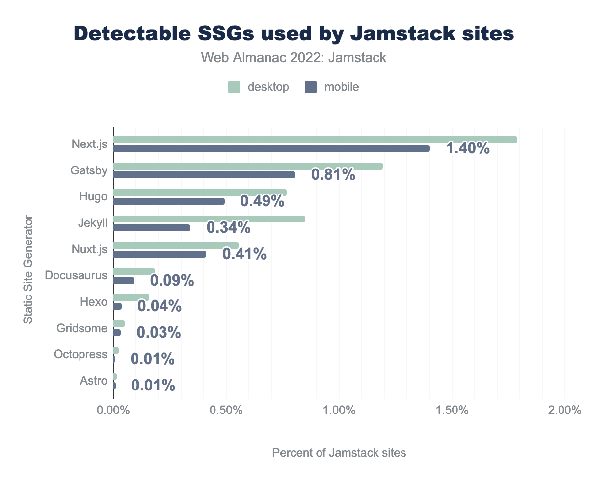 SSGについてはどうでしょうか?Wappalyzerはそれらを別のカテゴリとしています。ここに両方のサイトでの数値があります(注:私たちはNuxt.jsとNext.jsを手動でこのリストに追加しました。WappalyzerはそれらをSSGとはみなしませんが、どちらもそのように使用することができるので、それらを考慮するのは有用だと思いました)。全サイトに対するそれらの数値です。