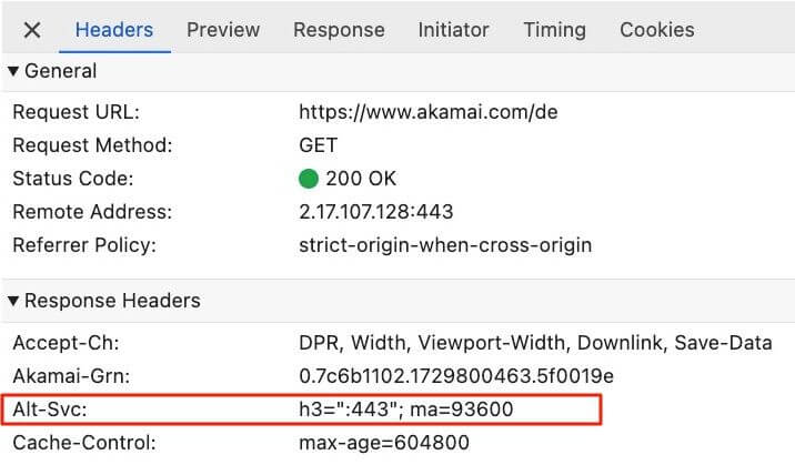 alt-svc HTTPレスポンスヘッダーが表示されており、www.akamai.comのUDPポート443でALPN値h3とmax-ageが26時間のHTTP/3をサポートしていることを示しています。alt-svcレスポンスヘッダーの例。