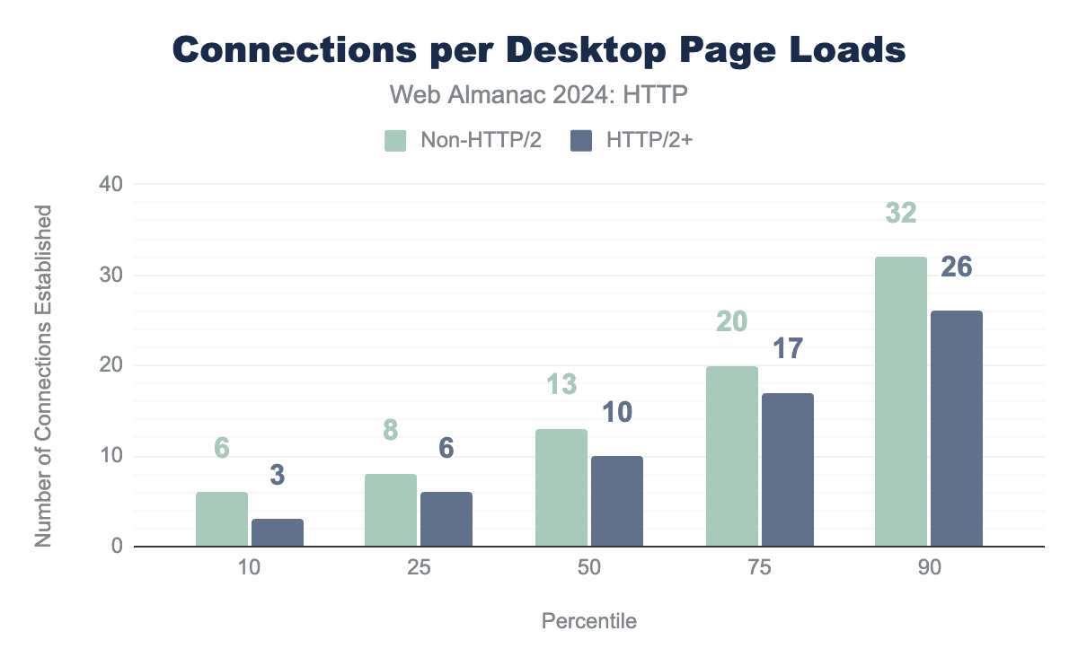 ただし、ここでの違いは数年前ほど明確ではありません。2021年には、プロトコルバージョン間でp50とp75で4つの接続差がありましたが、現在は3つに縮小しています。これは、HTTPキャッシュのパーティショニング、crossoriginの悩み、またはおそらくより多くのサードパーティが使用されているなどの側面による可能性があります。しかし、新しいプロトコルが実際に接続数を減らし、効率を向上させることは依然として明らかであり、p10では必要な接続は半分しかありません!