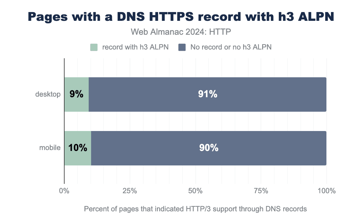 h3 ALPNトークンが設定されたDNS HTTPSレコードを使用し、91%がDNS HTTPSレコードをまったく使用しないか、h3 ALPNトークンが設定されていないものを使用していました。モバイルでは、ページの10%がHTTP/3対応のDNS HTTPSレコードを使用していました。これは、データセットで考慮されたすべてのページの9〜10%(または2,000万以上)がDNSを介してHTTP/3のサポートを示していることを意味します。ただし、これは自動的にHTTP/3がブラウザで実際に使用されることを意味するわけではありません。この章の最初の画像で示したように、実際にHTTP/3で読み込まれたページは約7%(デスクトップ)から9%(モバイル)にすぎませんでした。これは間違いなくDNS HTTPSの採用と同じ桁数ですが、まったく同じではありません。