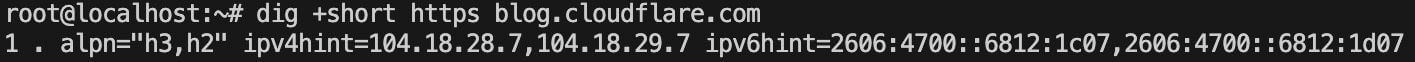 digコマンドラインツールからのスクリーンショット。DNS HTTPSレコードがalpn h3とh2をリストし、blog.cloudflare.comのipv4hintとipv6hintの両方を提供していることを示しています。ご覧のとおり、blog.cloudflare.comは、応答のalpn="h3,h2"部分を介して、HTTP/3とHTTP/2の両方のサポートを示しています(優先順位順!)。ALPNはアプリケーション層プロトコルネゴシエーションの略で、元々はサーバーがサポートするアプリケーションプロトコルとバージョンを示すためのTLS(トランスポート層セキュリティプロトコル)拡張機能でした。たとえば、上記で説明したHTTP/2からHTTP/1.1への正常なフォールバックを可能にするためです。