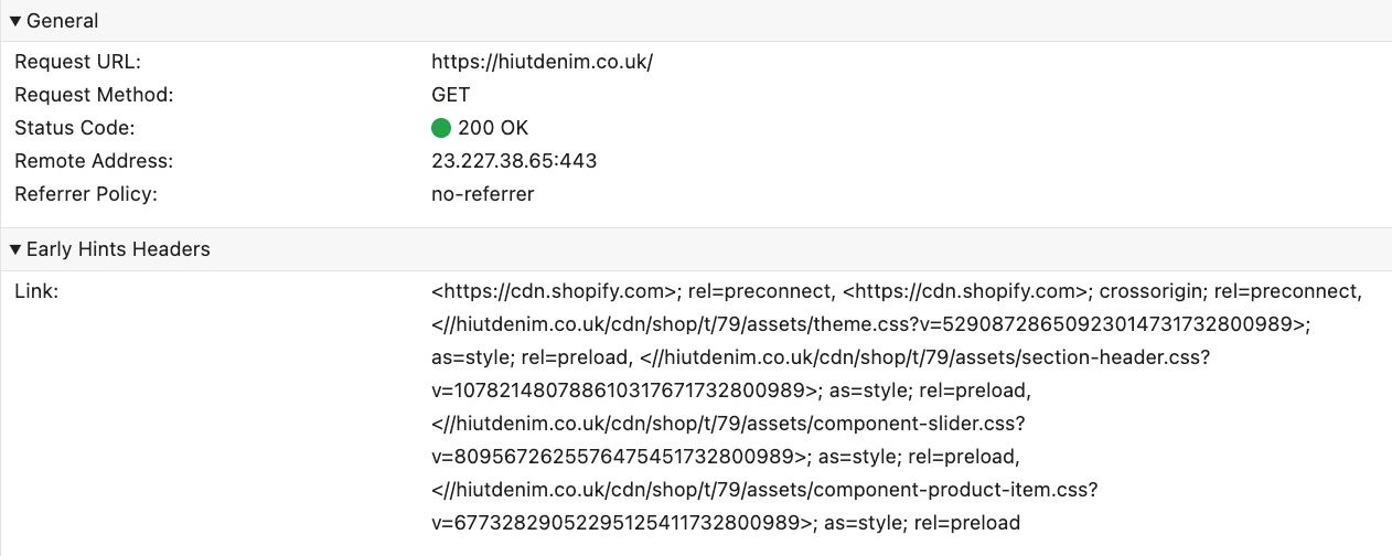 驚くべきことに、Early Hintsの圧倒的多数が1つのデプロイメント、Shopify(Cloudflareの顧客)から来ていることがわかります。これは、Early Hintsをサポートするデスクトップページの2.9%のうち90%を占めています。つまり、新しい機能を採用した非Shopifyのデスクトップホームページは約39,000ページしかありません。したがって、Web Almanacのデータセットで見られるものに基づいて、その真の可能性について広範な結論を導き出すのは困難であり、あまり役に立ちません。