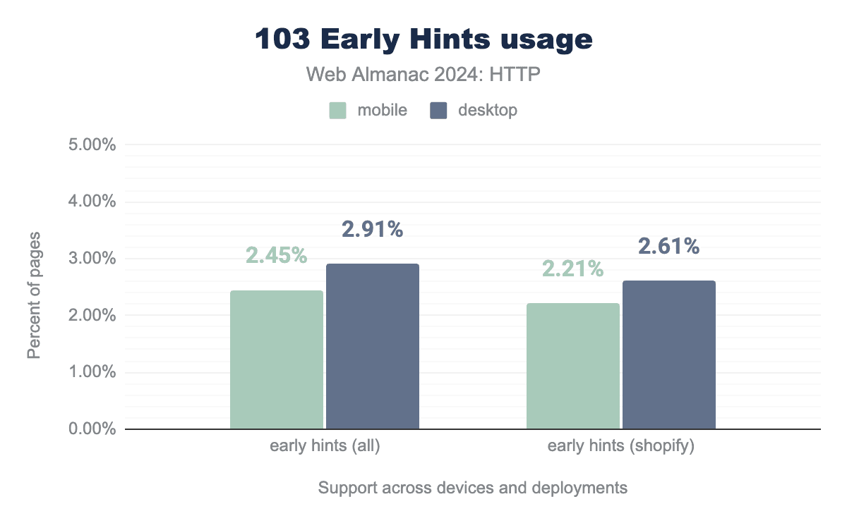 残念ながら、103 Early Hintsの採用は、2022年の最初の調査以来、あまり増加していません。当時の全デスクトップページの1.6%から、今年はわずか2.9%にすぎません。しかし、この機能を適切に構成するのは簡単ではなく、完全なメリットを得るには通常、CDNまたは同様に分散されたデプロイメントを使用する必要があるため、これはそれほど驚くことではありません。