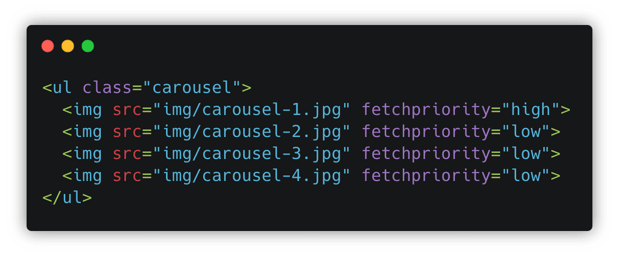 highの値を使用して画像カルーセルの最初の画像の優先度を上げるFetch Priority APIの例を示しています。一方、lowを使用して、最初に非表示になっている他の画像の優先度を下げています。ブラウザは、リソースの優先度を決定するために、複雑なヒューリスティック(「経験則」)のセットを使用します。HTMLドキュメント内の位置、タイプ、async/deferなどの読み込み修飾子などの要因に基づいています。しかし、これは、ブラウザが間違えることがある、またはより賢明な選択をするのに十分な情報がないことを意味することもあります。