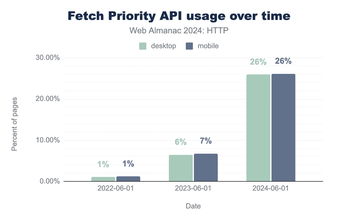Fetch Priorityの採用は2024年に飛躍的に増加しました!2023年の約7%から2024年には少なくとも1つのfetchpriority属性を使用するページが26%に増加したのは、本当に驚くべき結果です。多くのページでは1つ以上のインスタンスが使用されており、90パーセンタイルではページあたり2回、デスクトップページでは95パーセンタイルで最大9回使用されています(リソースヒントと同様に、もちろんやりすぎている人もいます。あるページでは信じられないことに2382回も使用されています!)。