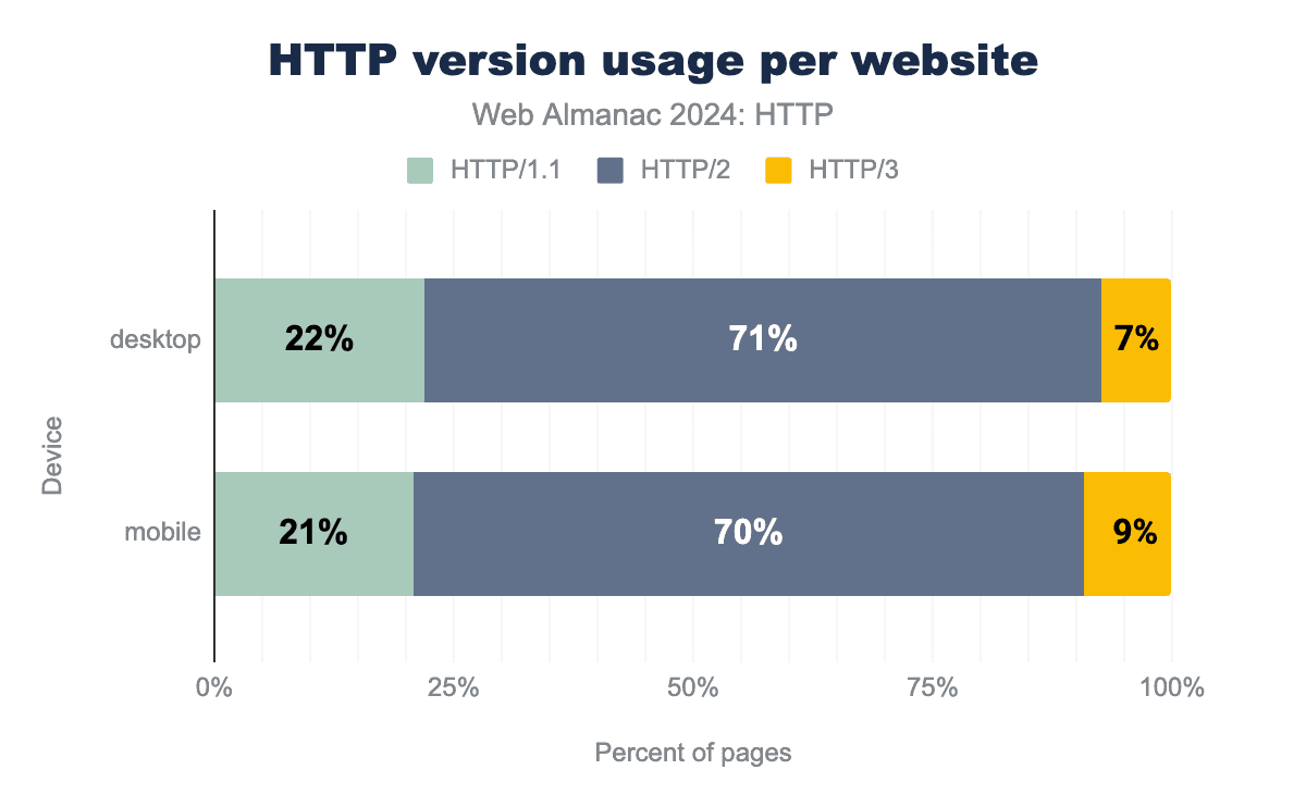 1つの例は、Happy Eyeballs(はい、本当に!)と呼ばれるアルゴリズムです。これは、いくつかの異なるオプションをテストして選択する方法を説明しています。これは、HTTP/2とHTTP/3のどちらかを選択するために使用されますが、元々発明されたIPv4とIPv6にも使用されます。このアルゴリズムは、通常、異なる接続を互いに「競争」させ、その後「勝者」を選択してページ読み込みを続行します。つまり、HTTP/2が競争に勝った場合、HTTP/3がサポートされていてもHTTP/2が表示されることがあります。このデータはまだデータセットで追跡されていないため、これがどのくらいの頻度で発生するかはわかりませんが、実際には、これはテスト場所や使用されているネットワークにも大きく依存します。
