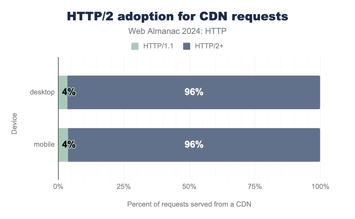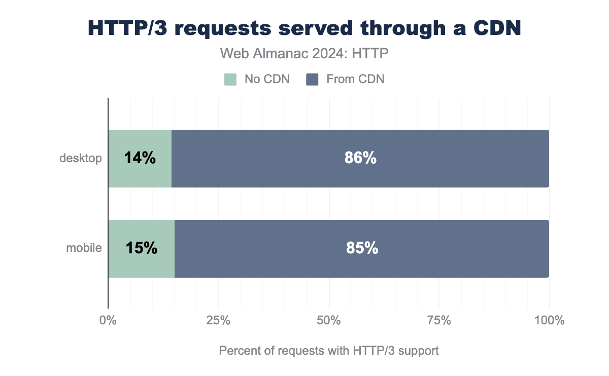 それでも、個人的には、コンテンツだけでなく、使用される技術スタック、そしてプロトコルも含めて、ウェブ上で選択の自由があるのは良いことだと感じています。重要なことに、現在のCDNへの(パフォーマンスとセキュリティのための)過度の依存には、独自の欠点もあります。一部の人々は、いくつかの大企業を中心にウェブが「中央集権化」されることを恐れています。まだそこまでには至っていないと思いますが、以前に書いたように、新しいプロトコルを大規模に展開するための技術的なノウハウを持っているのが、ますますCDN/大企業だけになっているという憂慮すべき事実についてです。ここで正しい答えはわかりませんが、両方の側面を強調するのは良いことだと感じています!これについてどう思うかは別として、CDNがすでに今日のウェブの大部分を占めており、新しいHTTPバージョンの採用を推進していることは明らかです。