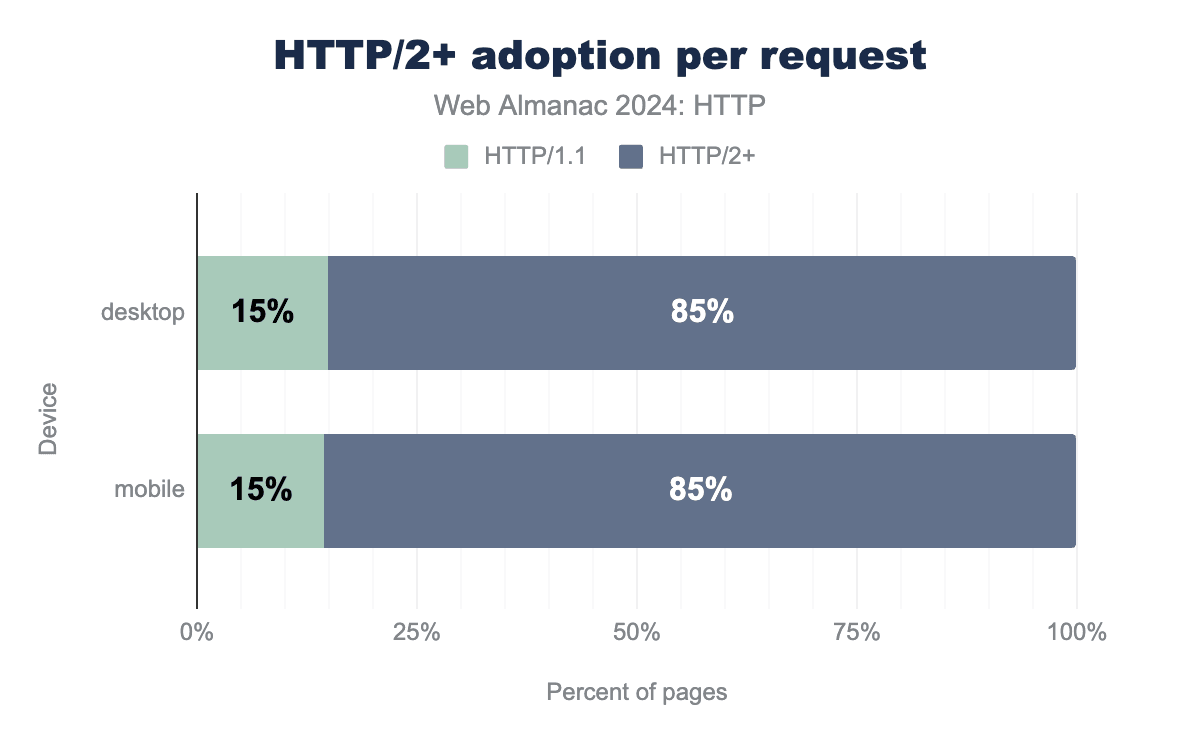 したがって、2024年にはホームページの21〜22%しかHTTP/1.1で読み込まれていないことがわかります。これは、2022年の34%や、とくに2020年のHTTP/1.1とHTTP/2+がほぼ50/50の割合だったのとは著しい違いです。しかし、これはページのメインドキュメント(HTML)がどのように読み込まれるかを見ているだけです。HTTPの採用を見るもう1つの方法は、すべてのリクエスト(サブリソースやサードパーティを含む)に使用されるバージョンを見ることです。これにより、結果はさらにHTTP/2+に偏ります。