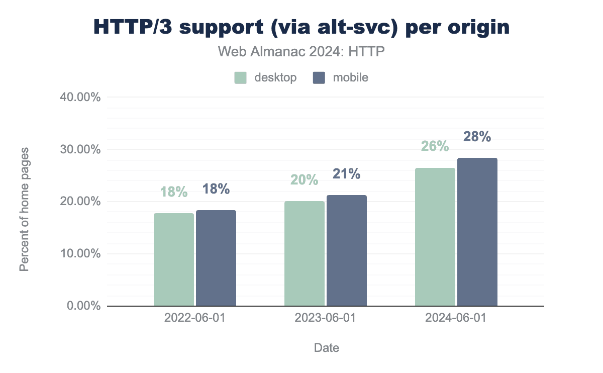 2022年6月にHTTP/3のサポートを最後に見たとき、プロトコルはまだ完全に標準化されていませんでした。それでも、一部の大手企業による早期の展開により、HTTP Archiveデータセットのサイトの約18%がHTTP/3のサポートを示していました。2年後の今、新しいプロトコルのサポートは着実に増加し、26%(デスクトップ)から28%(モバイル)に達し、全体で10%近く増加していることがわかります。それでも低いように思えるかもしれませんが、実際にはHTTP/2の進化と非常によく似ており、標準化後2年目(2017年)には同様に約30%の普及率が見られました。