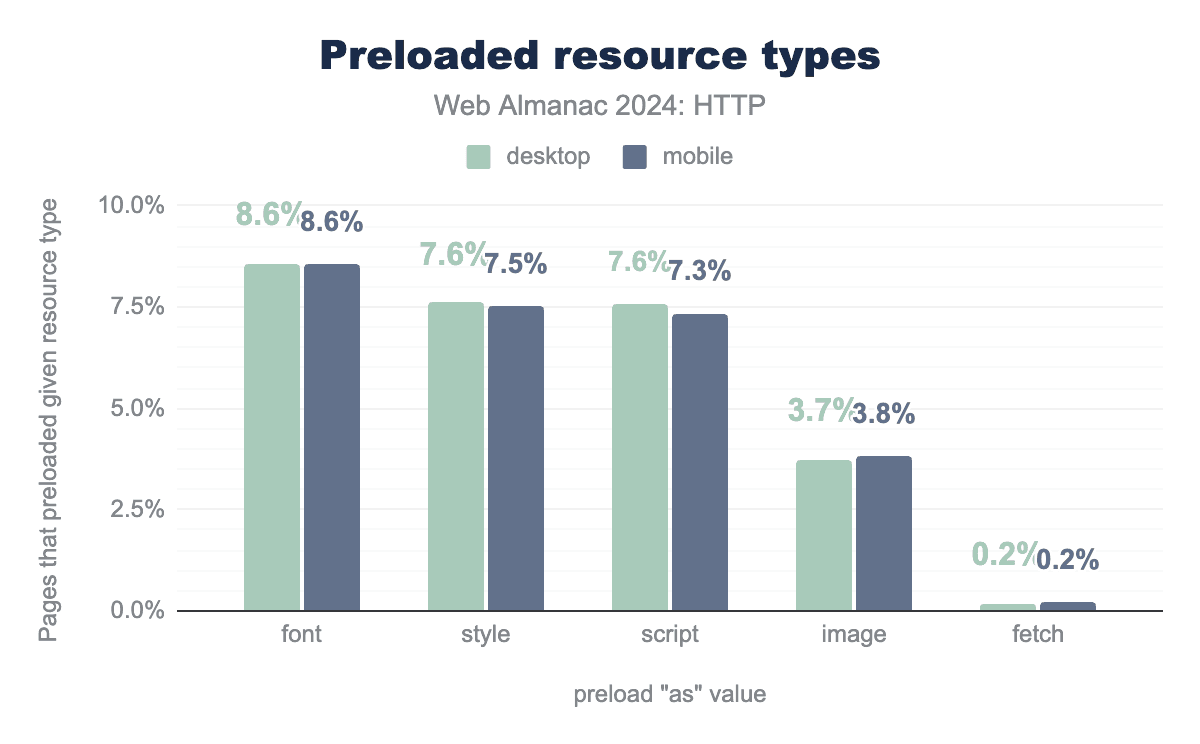 preloadを使用しているページの割合を示す棒グラフ。フォントはすべてのデスクトップおよびモバイルページの8.6%でプリロードされ、スタイルシートはデスクトップページの7.6%およびモバイルページの7.5%でプリロードされ、スクリプトのプリロードはデスクトップページの7.6%およびモバイルページの7.3%で見られ、画像はデスクトップページの3.7%およびモバイルページの3.8%でプリロードされ、フェッチコールはモバイルおよびデスクトップページの両方の0.2%でプリロードされます。予想どおり、フォントはプリロードのもっとも人気のあるターゲットであり、ページの約8.6%で発生しています。
