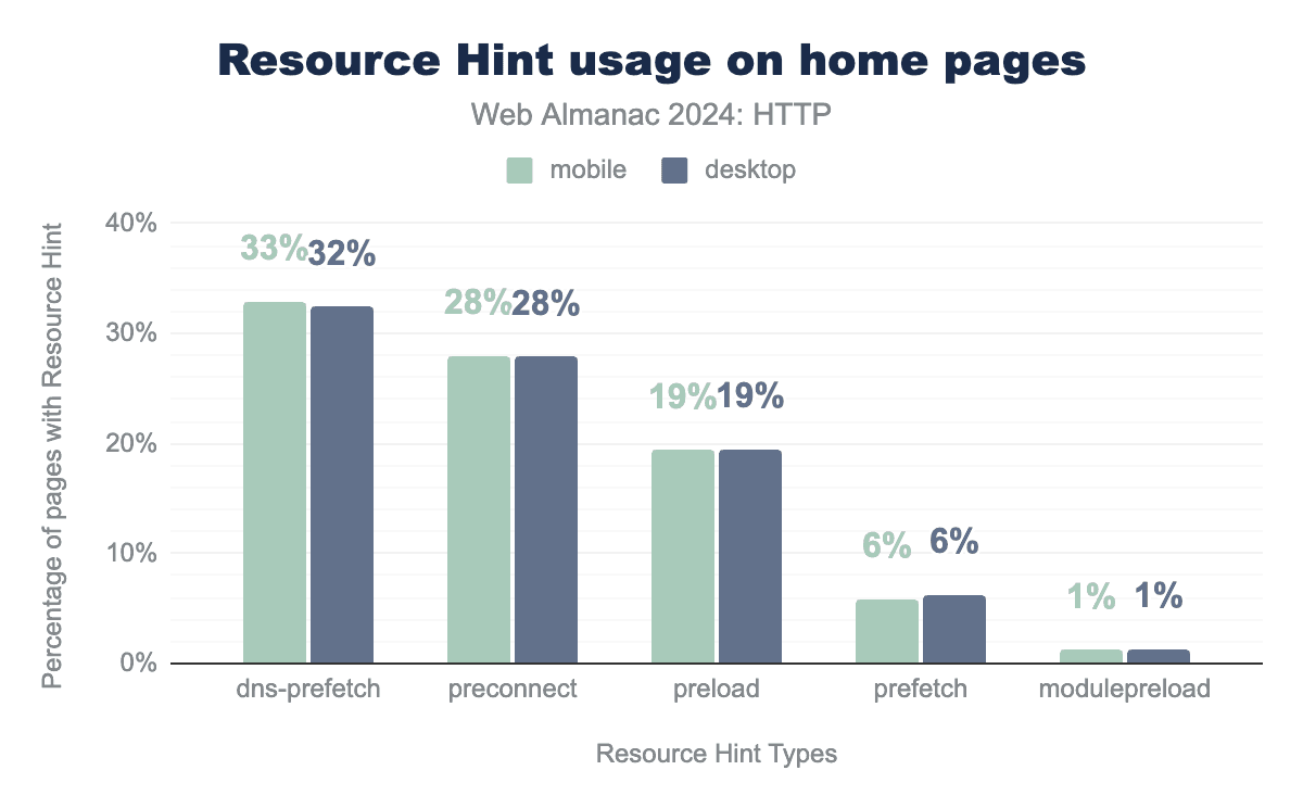 dns-prefetchはすべてのモバイルページの33%(デスクトップでは32%)で使用され、preconnectは28%のページ(デスクトップとモバイル)で使用され、preloadは19%のページ(デスクトップとモバイル)で使用され、prefetchは6%、modulepreloadは1%で使用されています。これらのディレクティブは長年にわたって目覚ましい普及を遂げており、データセットの全ページの30%以上がdns-prefetchを使用し、28%がpreconnectを利用し、preloadは20%に近づいています。